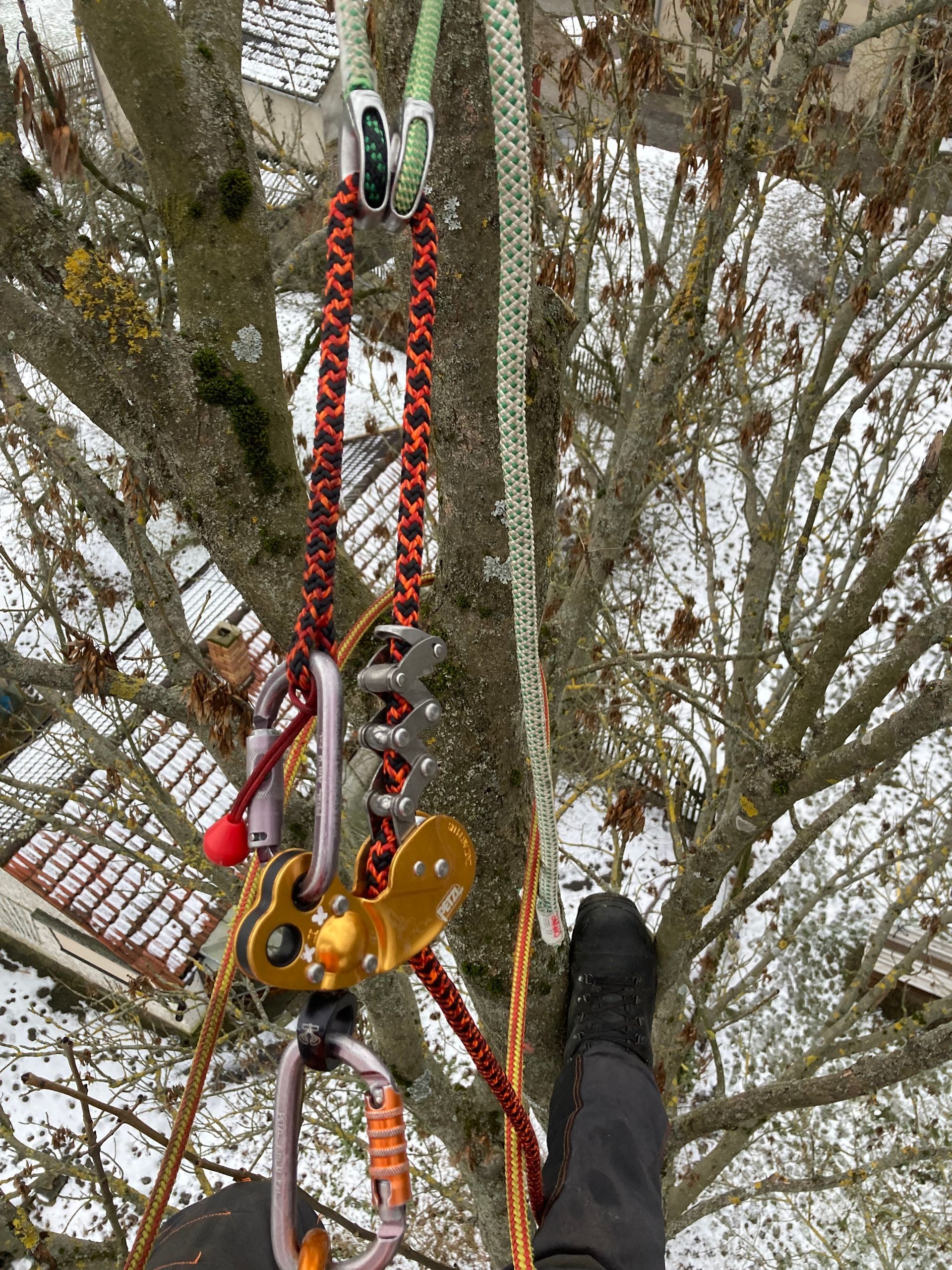 Die Seilklettertechnik beinhaltet die Verwendung von speziellen Seilen, Gurten und Karabinern, um sich an einem Baum zu sichern und zu bewegen. Diese Ausrüstung ermöglicht es einem Baumpfleger, sich frei im Baum zu bewegen und an verschiedenen Stellen zu arbeiten, ohne den Baum zu beschädigen oder sich selbst zu gefährden.